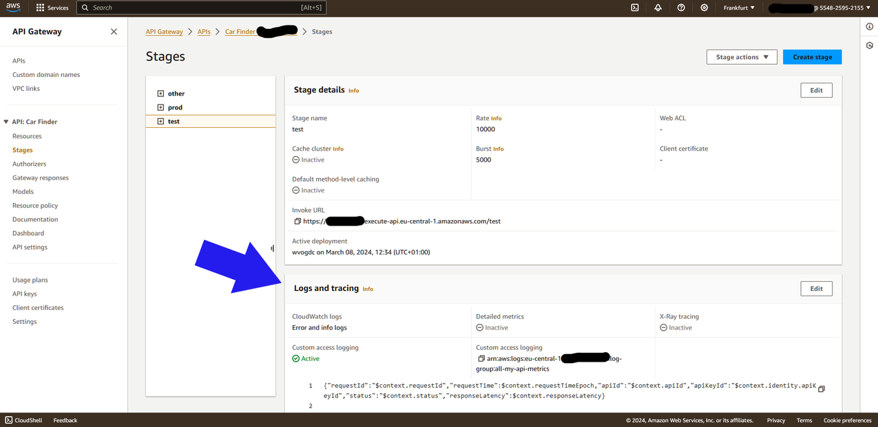 In the API gateway, select the API, then go to stages and select the stage that you have configured in the API Control Plane agent. You will see a configuration box labeled Logs and tracing.