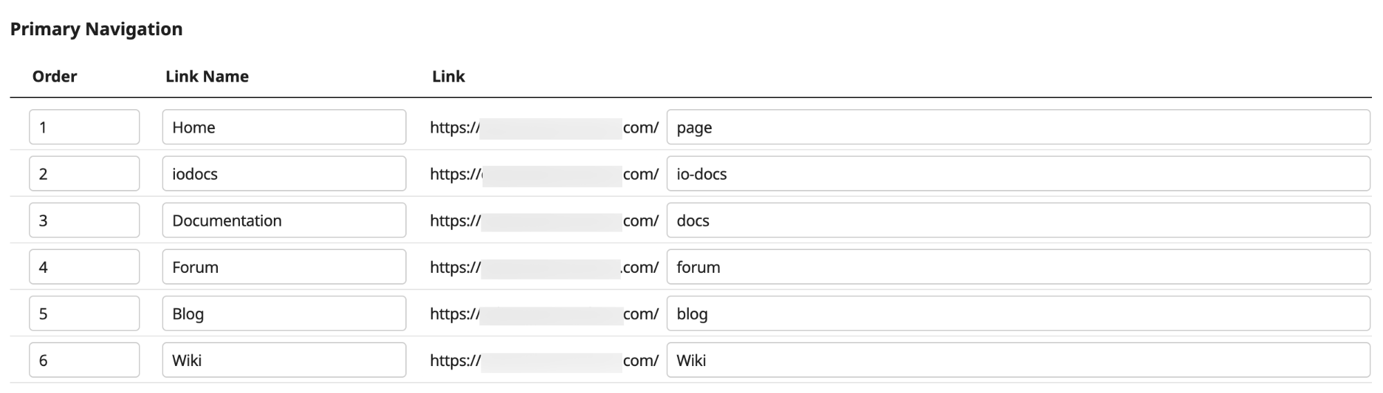 The Primary Navigation section allows you to add links that are displayed as tabs in the Portal view pages by default or provide additional links to pages within the domain using custom CSS and JavaScript. You can set the order of the pages, link names, and paths for the pages to be linked. You can add up to 6 links.
