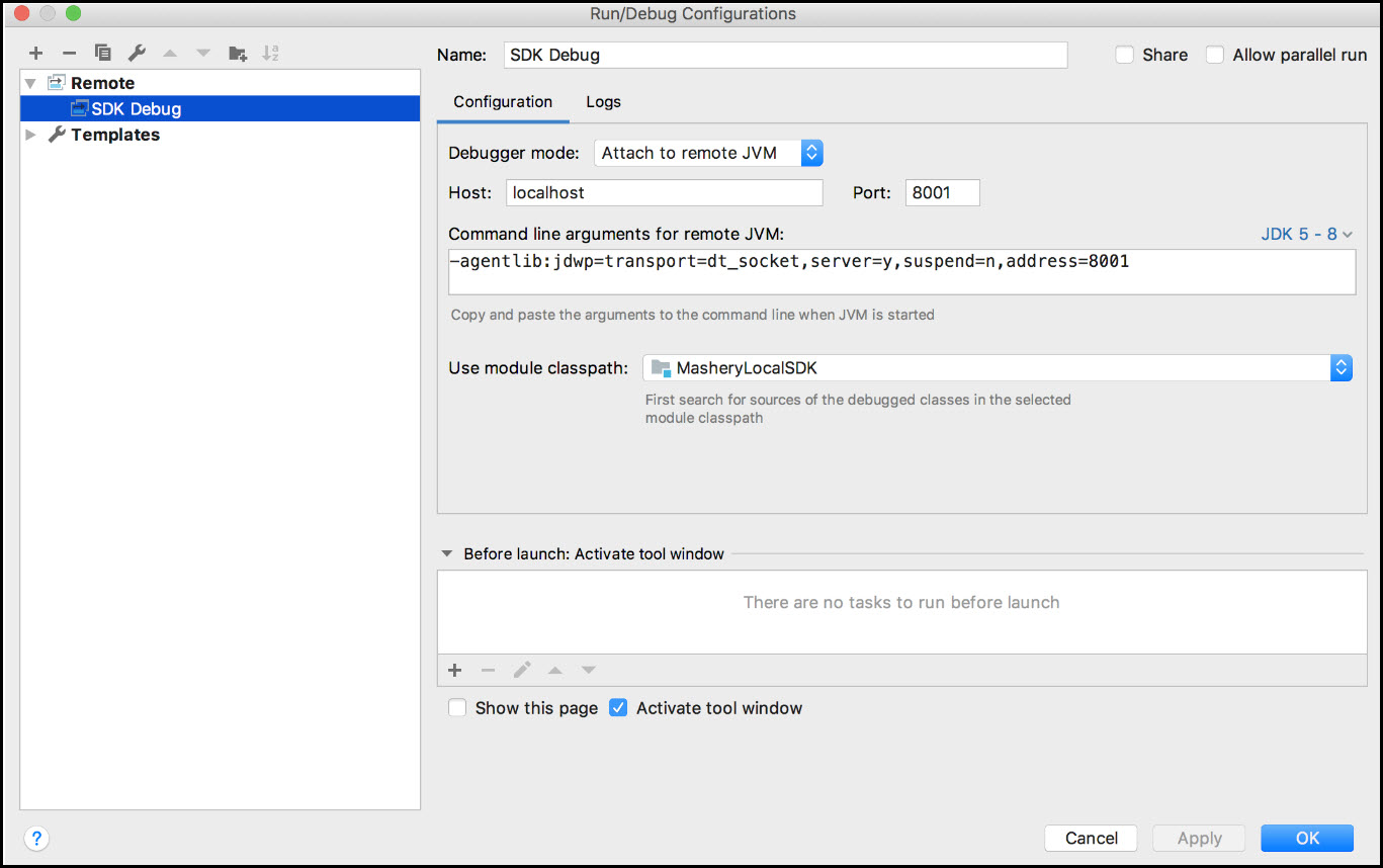 In the Run/Debug Configurations window, click SDK Debug in the tree structure and provide the following values: