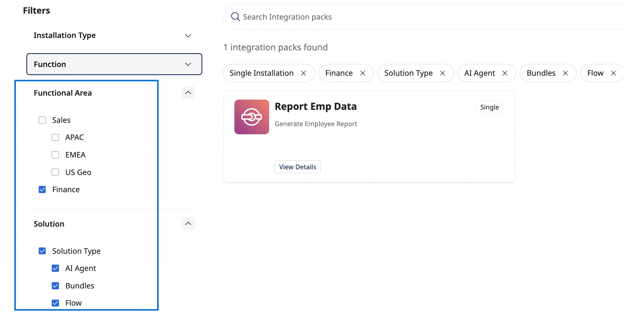 2. Use the filters on the left pane to conditionally narrow your view and view Integration Packs that match your selected Categories and Attributes.