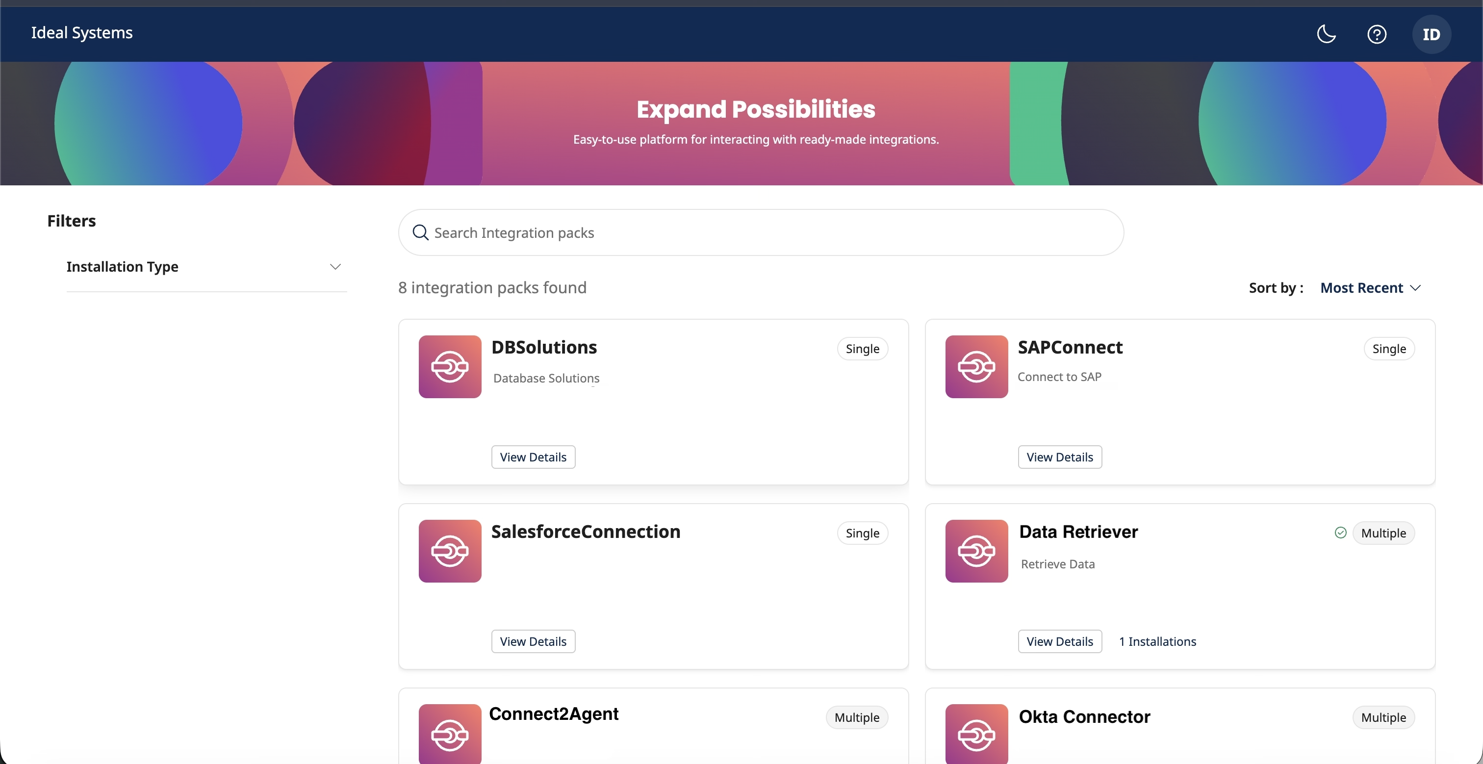 1. The Integration Pack listing view displays single-install and multi-install categorizations, by default.