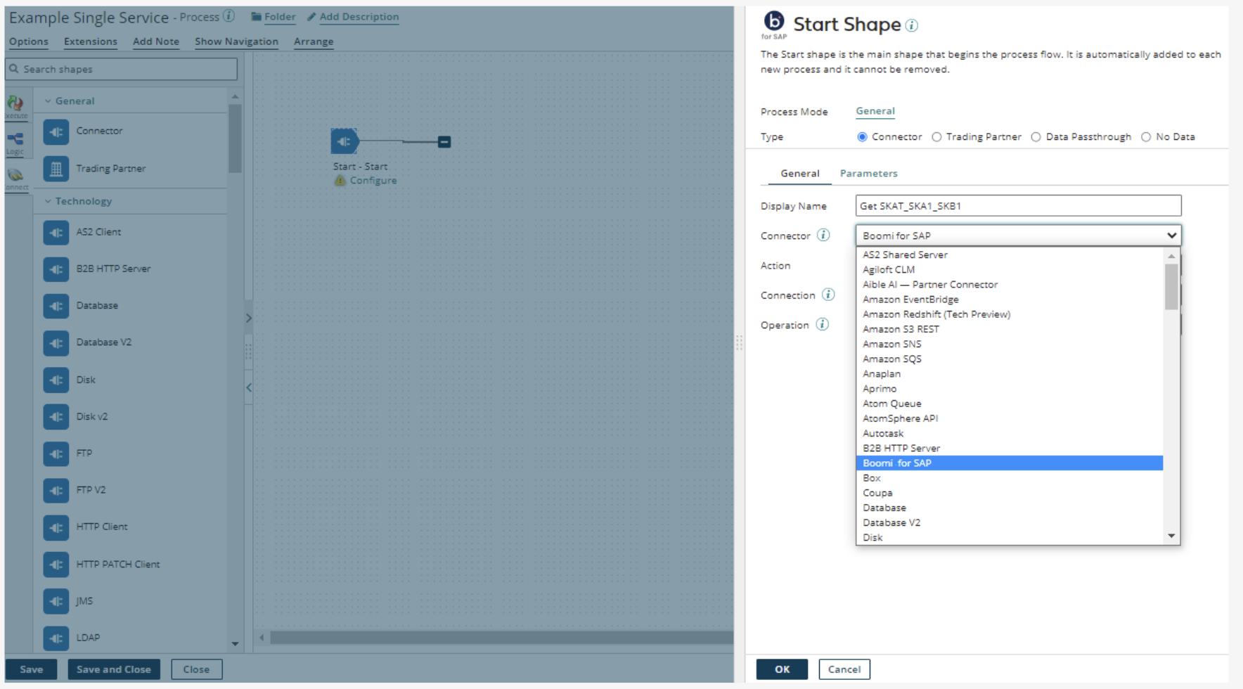 The Boomi for SAP connector can either be used in a Start step to begin a process or as a Connection step later in a process by searching for the connector and dragging it onto the canvas. The following sections show how to create a new method using the Boomi for SAP in a Start step. However, the options are the same in both cases.