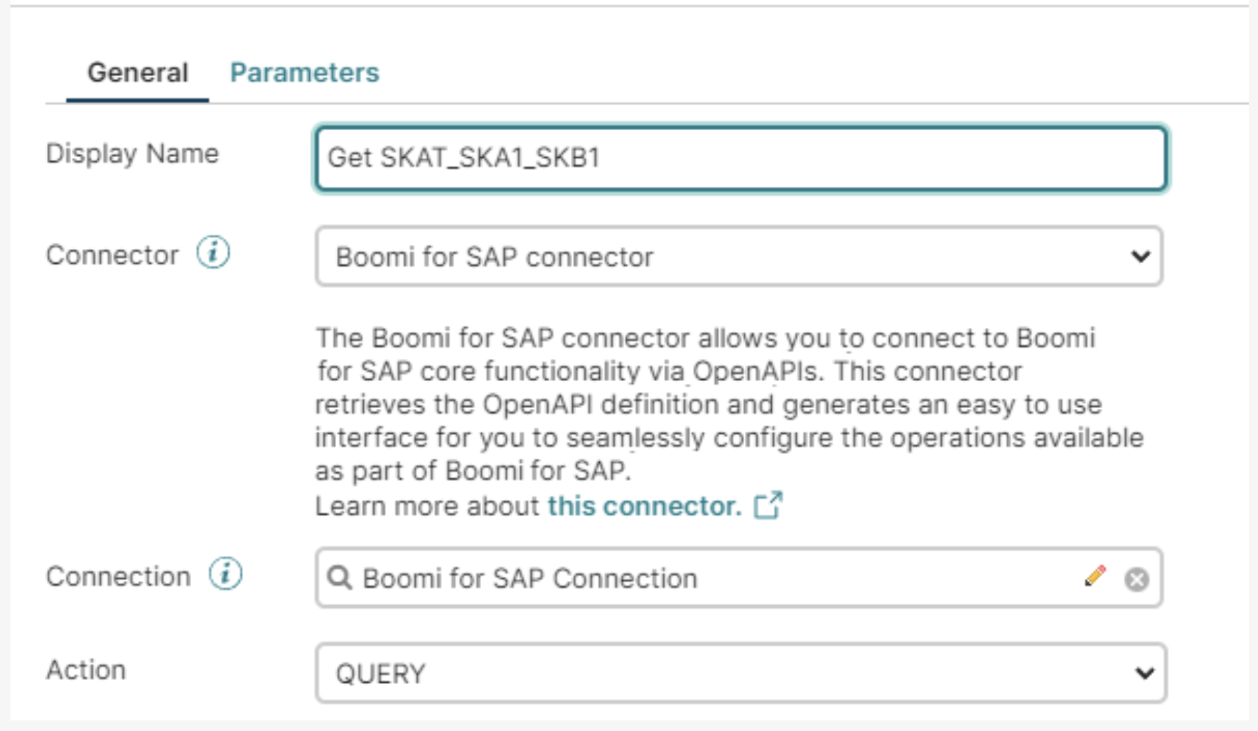 By default, choosing Boomi for SAP sets the action to QUERY.