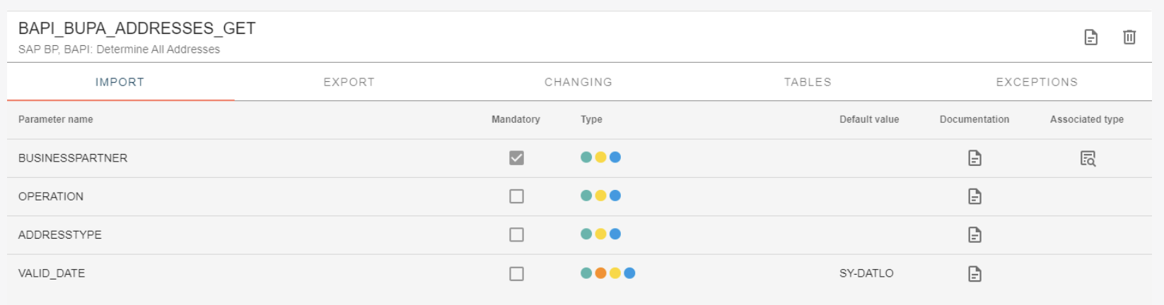 The Import, Export, Changing, or Tables Function Module elements contain the following parameters: