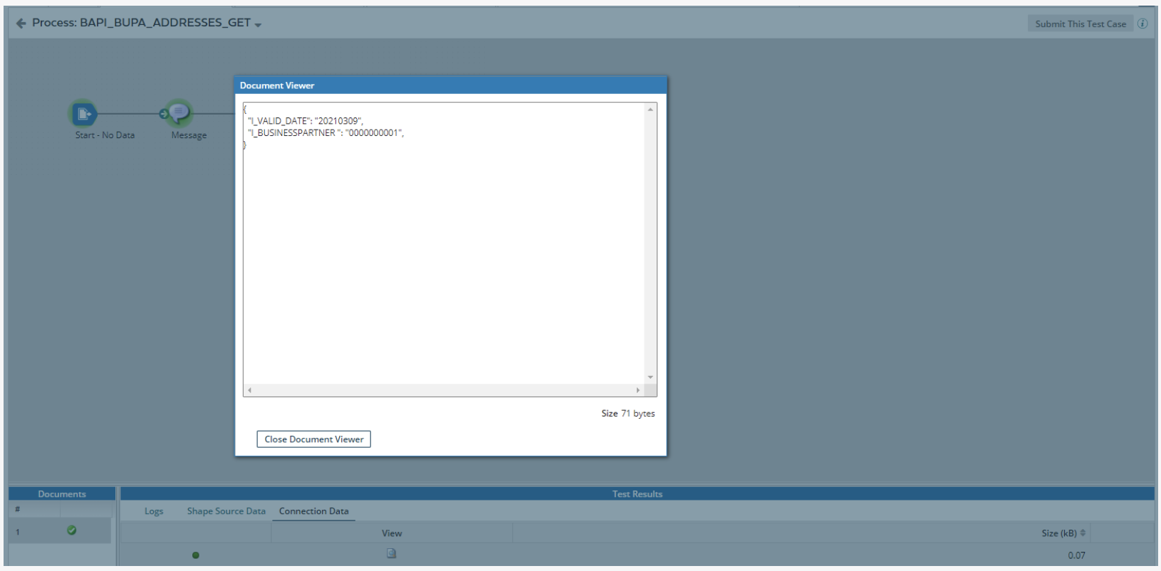 Add a Message step immediately after the Start step and connect them. In this example process, the Message step contains test data corresponding to the Request Profile created in the next step. When building your processes, map your data to the Request Profiles of the Operations.