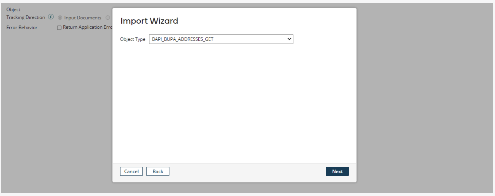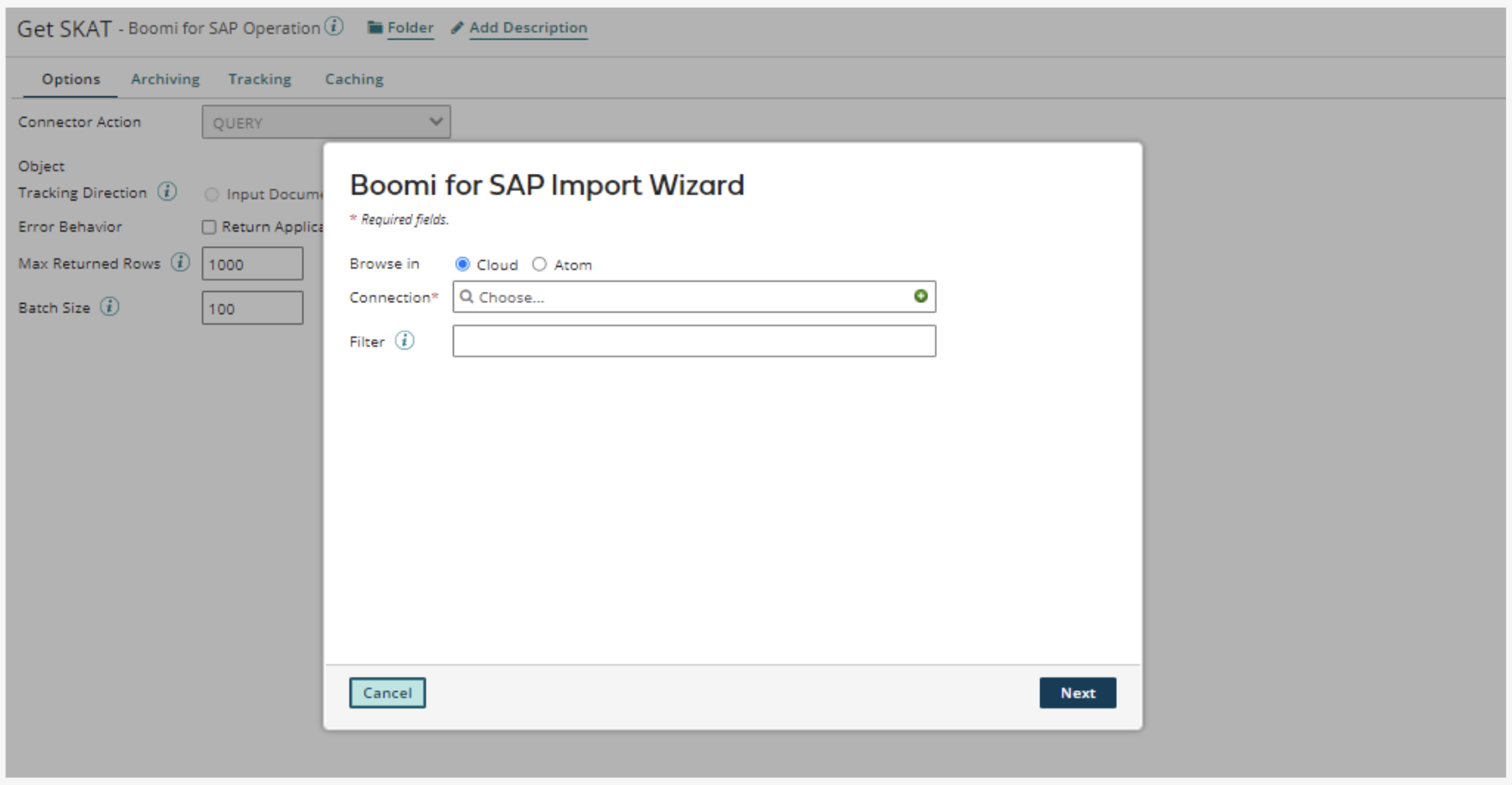 In the Import Wizard pop-up window, choose a basic runtime to run and perform the import. The basic runtime should have network access to the Boomi for SAP instance. In the Connector and Filter fields, choose the appropriate Connector and an optional Filter, which allows for wildcard filtering.