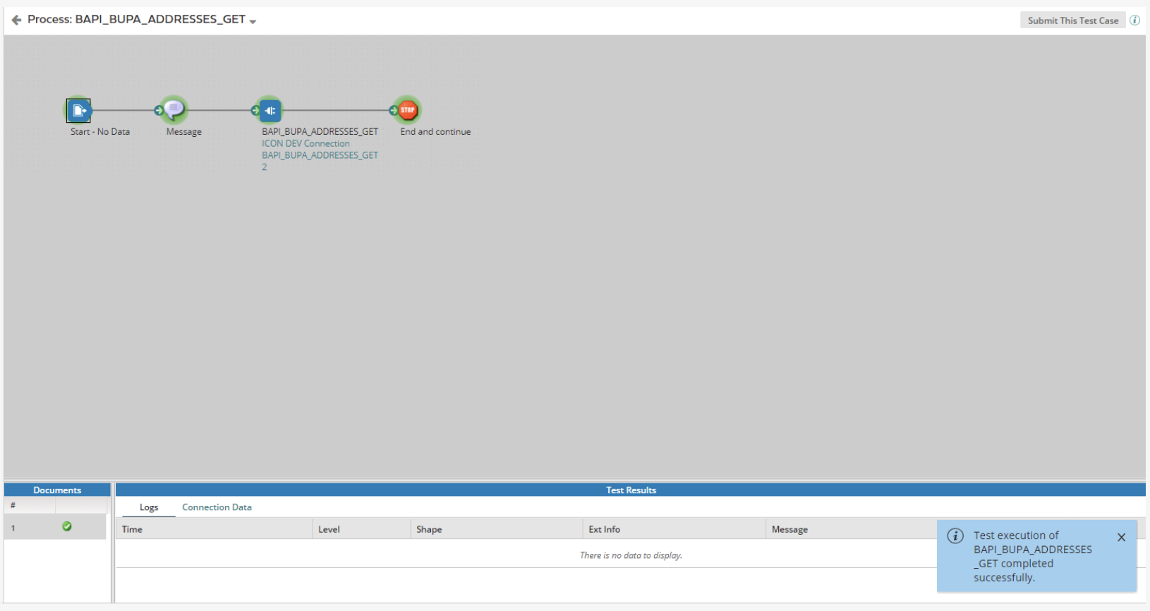 Once the test execution completes, a brief message will pop-up in the lower right corner stating that the "Test execution of BAPI_BUPA_ADDRESSES_GET completed successfully".