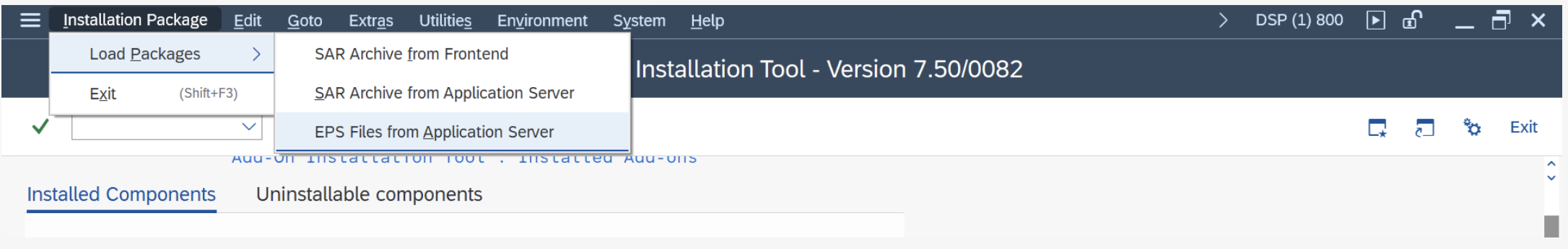 - Go to SAINT. On the Installation Package tab, select Load packages then EPS files from the application server to import the Add-On installation file(s).