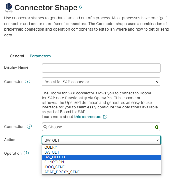 • Follow the same procedure to create a BW_DELETE Connector Operation, by selecting the BW_DELETE action.