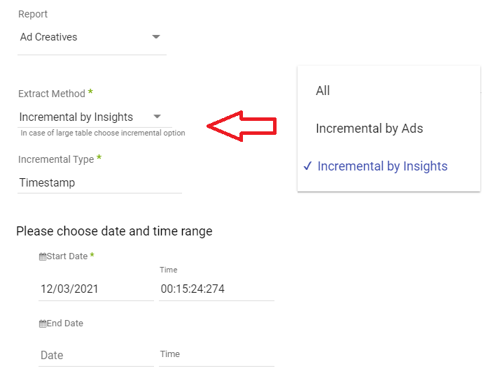 • Select the increment method (Ad accounts and Ad creatives only): You can select all to pull all data or incremental.