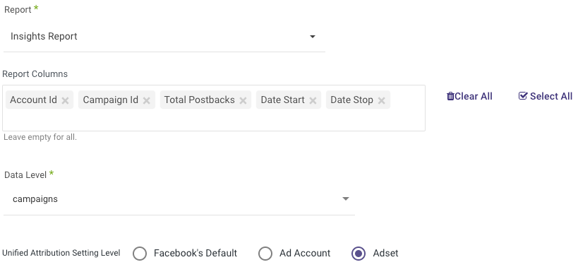 5. Leave empty to pull data for all available Facebook objects. The inputs are different between the reports. In each report, filter only the selected level or the level above. For example, select only campaigns and accounts in the campaigns report, while in the Accounts report, you can choose only accounts.