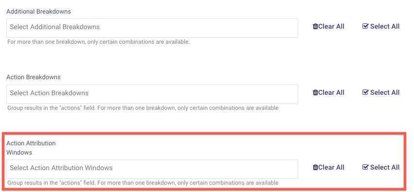 • Action attribution windows: Select the attribution windows to include in the Insights report. You can select multiple windows.