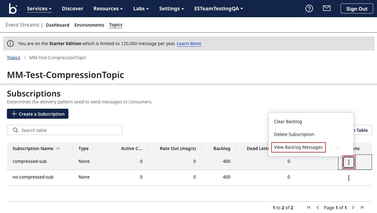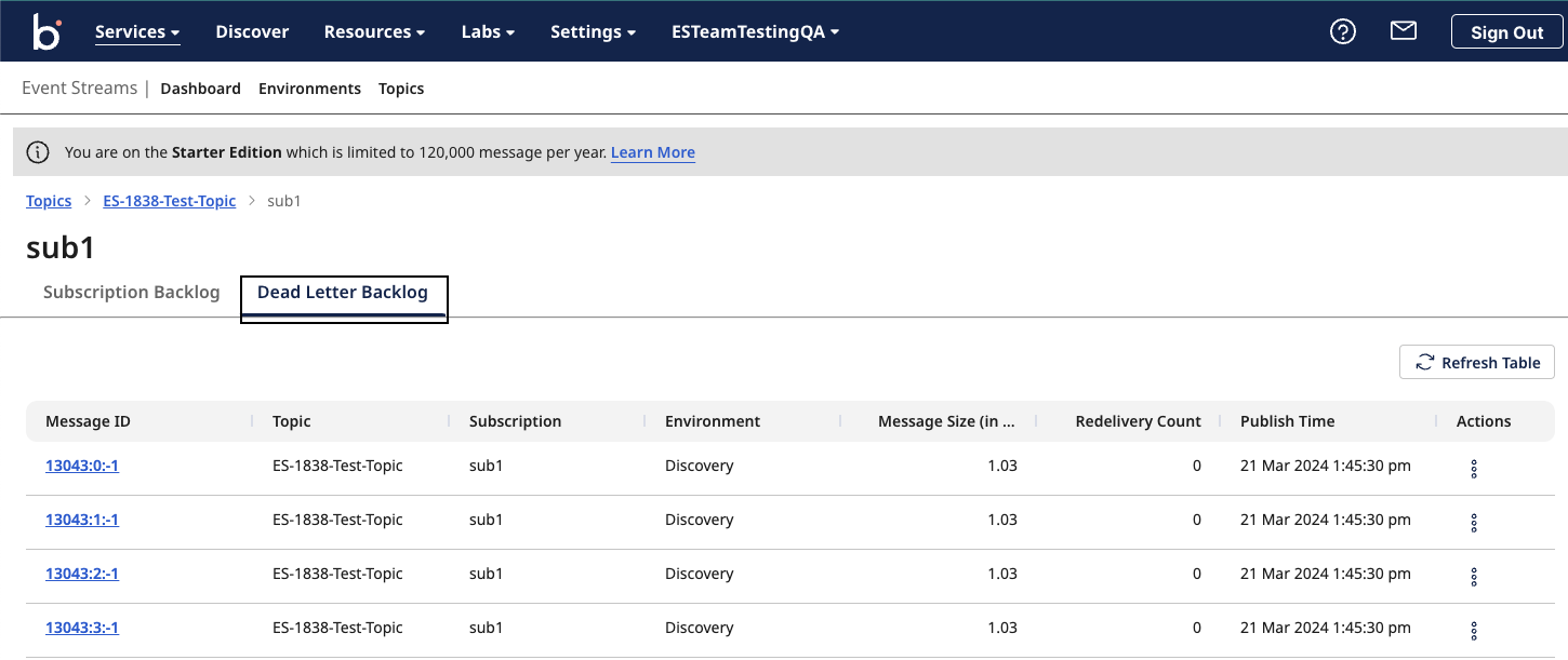 Navigate to Environment > Topics > Subscriptions. Click on the three dots under Actions > View Backlog Messages to view the messages. This opens the Message Management page on the View Backlog Messages default tab, Click on the Dead letter backlog tab to view dead letter backlog messages.