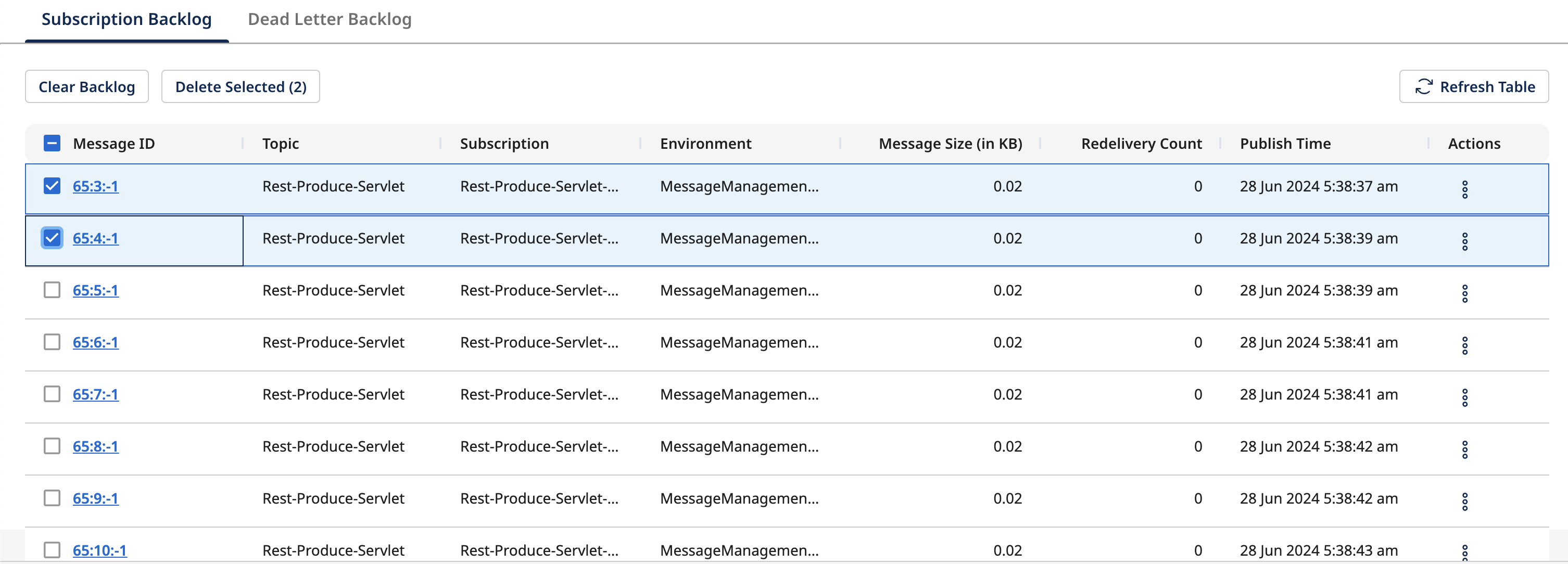 Navigate to Environment > Topics > Subscriptions. Click on the three dots under Actions > View Backlog Messages to view the messages. This opens the Message Management page on the View Backlog Messages default tab.