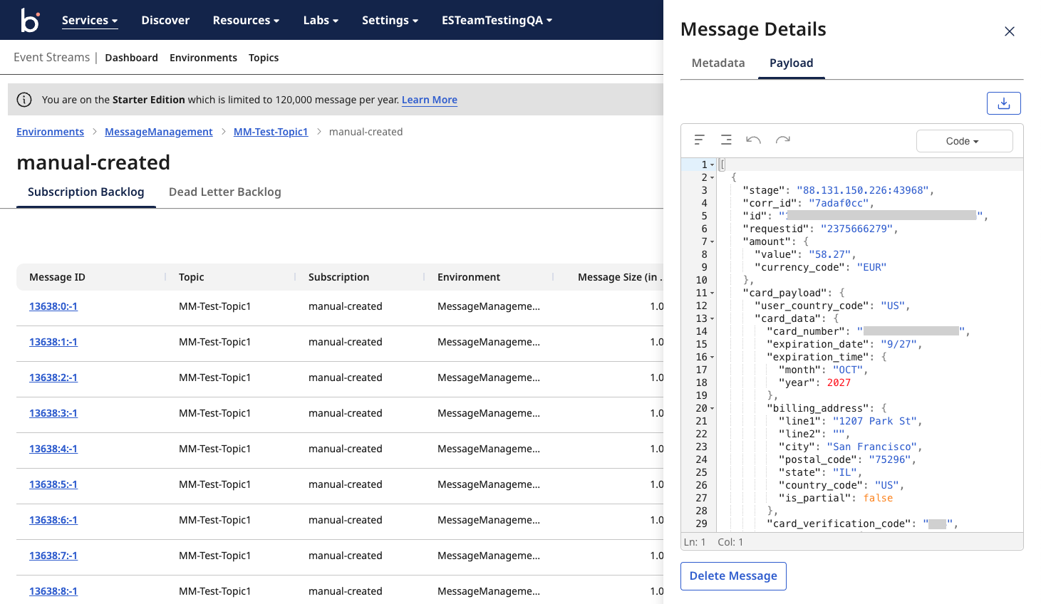 Same as the Backlog Messages tab, you can follow all the same steps to view a particular dead letter topic’s backlog messages, delete or clear individual dead letters, and download a message’s metadata and payload.