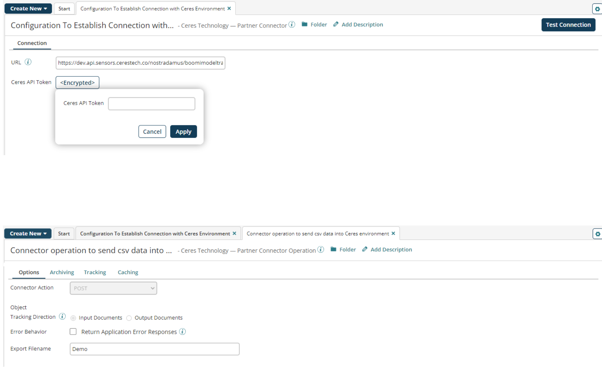 The Ceres Technology connection represents and contains all of the information that is needed to connect your account to Boomi Integration. If you have multiple Ceres Technology accounts, use a separate connection for each one and configure the token accordingly. You can pair a single connection with different Ceres Technology operations to perform a unique action against a Ceres Technology account.