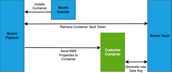 We provide two options for KMS: a fully Boomi-hosted vault, and a Boomi-hosted vault supplemented by a customer-managed vault. In both cases, the encryption in transit is handled by the Boomi-hosted vault. In the BYOV (Bring Your Own Vault) mode, secrets are re-encrypted on the customer container by the customer’s own HashiCorp Vault.