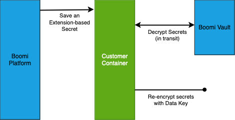 After you mark an encrypted field, such as a password field, as extensible and save a value, the Boomi Enterprise Platform encrypts the value with a wrapped data key stored in a Boomi-managed vault. The key can be viewed only when the runtime requests the vault to decrypt it. The decrypted value is sent to the runtime without being stored on the Boomi Enterprise Platform. After the runtime accesses the stored value, the vault immediately re-encrypts the value with a new data key which it then uses to encrypt the extensions variable. This new key is unique to the runtime and is not accessible by the platform.
