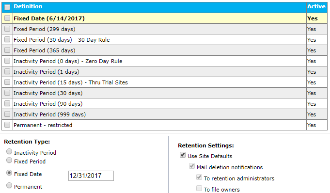 - The schedule part is unique where you can only create one definition for a given retention type plus number of days or date. For example, there can be only one rule for Inactivity Period (3 Days).