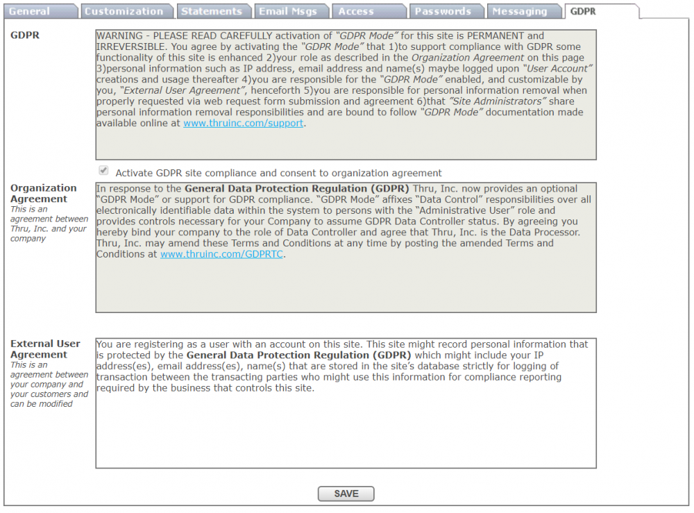 You agree by activating the “GDPR Mode” that to support compliance with GDPR some feature of this site is enhanced your role as described in the Organization Agreement on this page personal information such as IP address, email address, and name(s) may be logged upon “User Account” creations and usage thereafter you are responsible for the “GDPR Mode” enabled, and customizable by you, “External User Agreement”, henceforth you are responsible for personal information removal when properly requested via web request form submission and agreement that ”Site Administrators” share personal information removal responsibilities and are bound to follow “GDPR Mode” documentation made available online at www.thruinc.com/support.